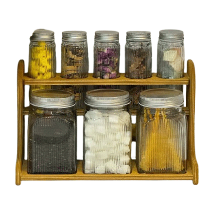 جنس ظروف از شیشه بوده و درب فلزی دارد جنس استند از چوب بوده و برش بسیار دقیق و زیبایی دارد.