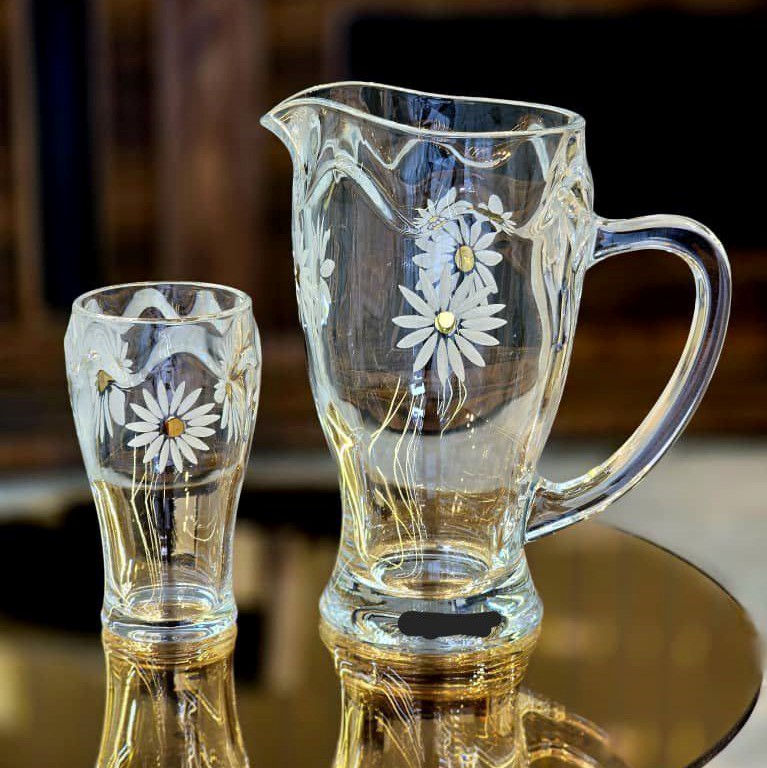 پارچ و لیوان حکاکی گل بابونه زیبایی خاصی در پذیرایی دارد و امکان ست کردن با سایر وسایل پذیرایی لب طلا یا رنگ طلایی را دارد. جنس بلور چینی بلور برند کن کن می باشد.