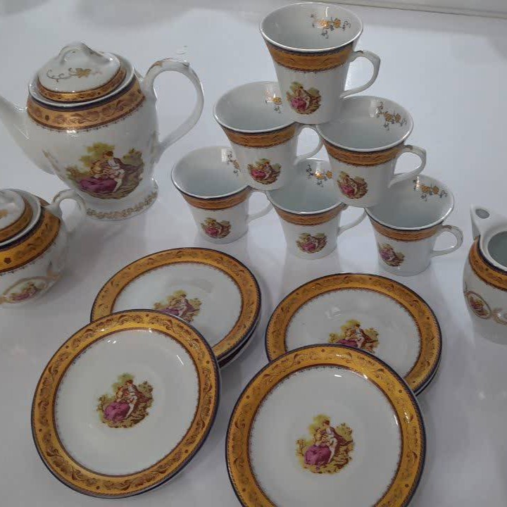 این سرویس شامل ۶ عدد فنجان ۶ عدد نعلبکی یک عدد قوری با درب و یک شکر ریز می باشد